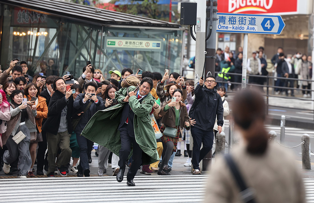 撮影初日は、雨が降りしきる中、新宿のど真ん中で、早朝から撮影スタート。約400人のエキストラが待機する中、雨が止まず、一時は撮影中止の暗雲が立ち込めましたが、トレードマークの青島コートを来た織田が登場した瞬間に雨が止むという奇跡が!